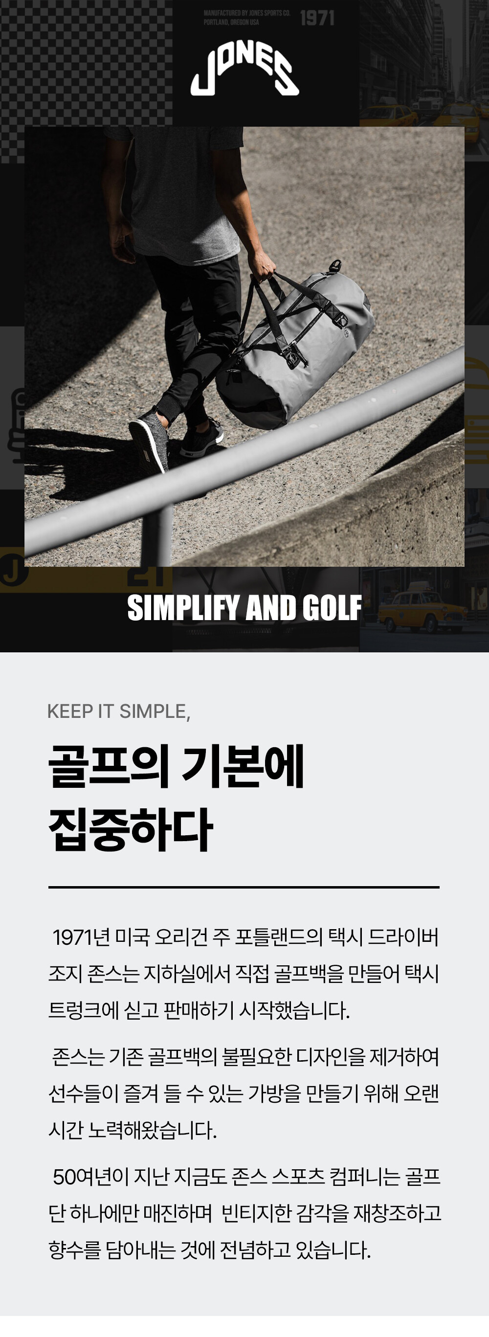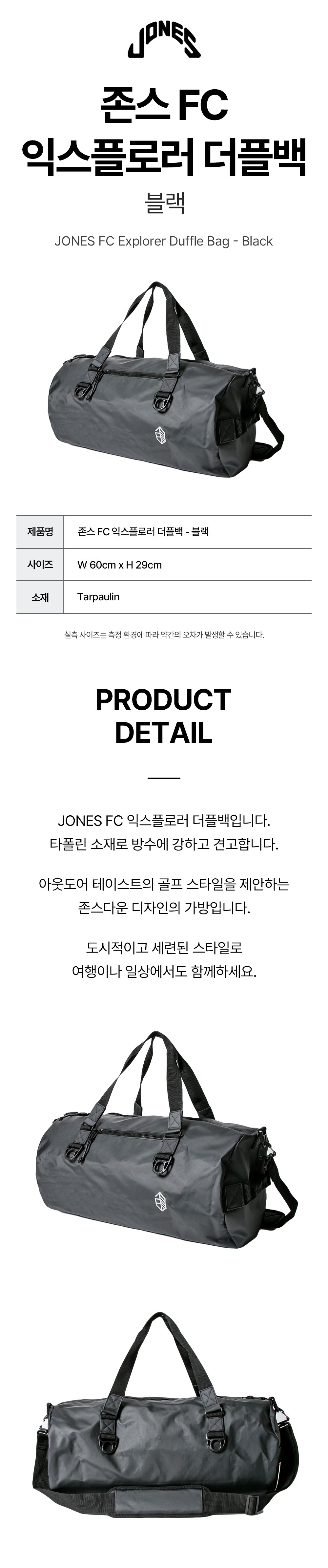 JONES FC 익스플로러 더플백입니다. 타폴린 소재로 방수에 강하고 견고합니다. 아웃도어 테이스트의 골프 스타일을 제안하는 존스다운 디자인의 가방입니다.