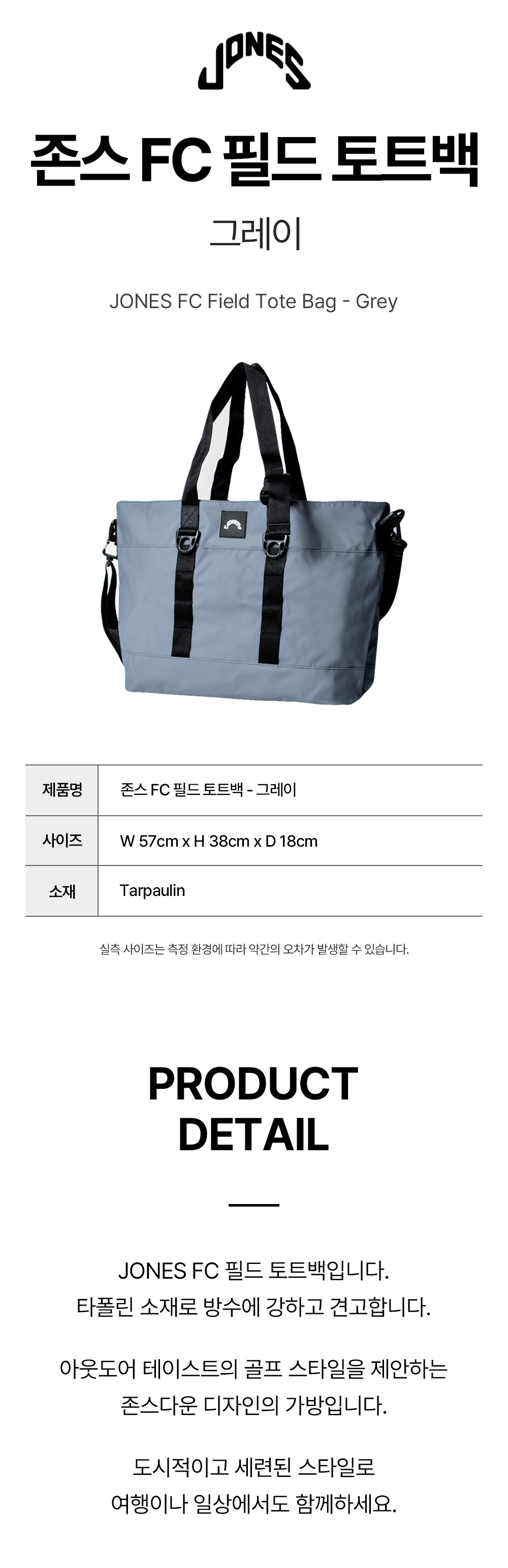 JONES FC 필드 토트백입니다. 타폴린 소재로 방수에 강하고 견고합니다. 아웃도어 테이스트의 골프 스타일을 제안하는 존스다운 디자인의 가방입니다.