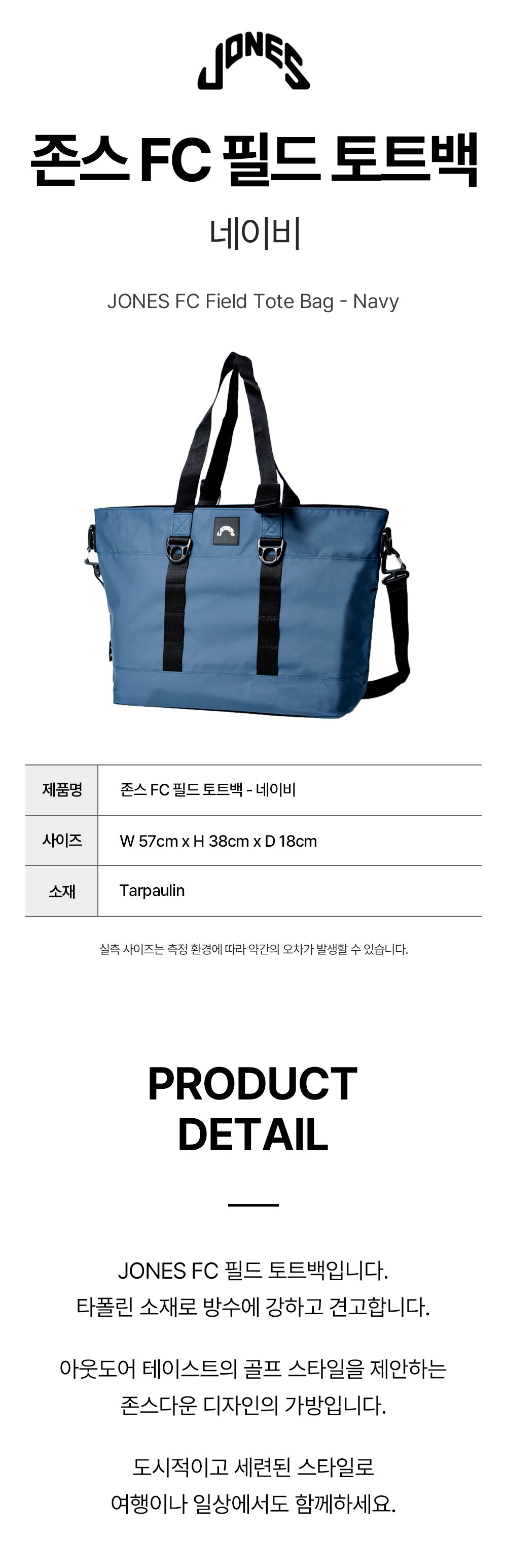 JONES FC 필드 토트백입니다. 타폴린 소재로 방수에 강하고 견고합니다. 아웃도어 테이스트의 골프 스타일을 제안하는 존스다운 디자인의 가방입니다.