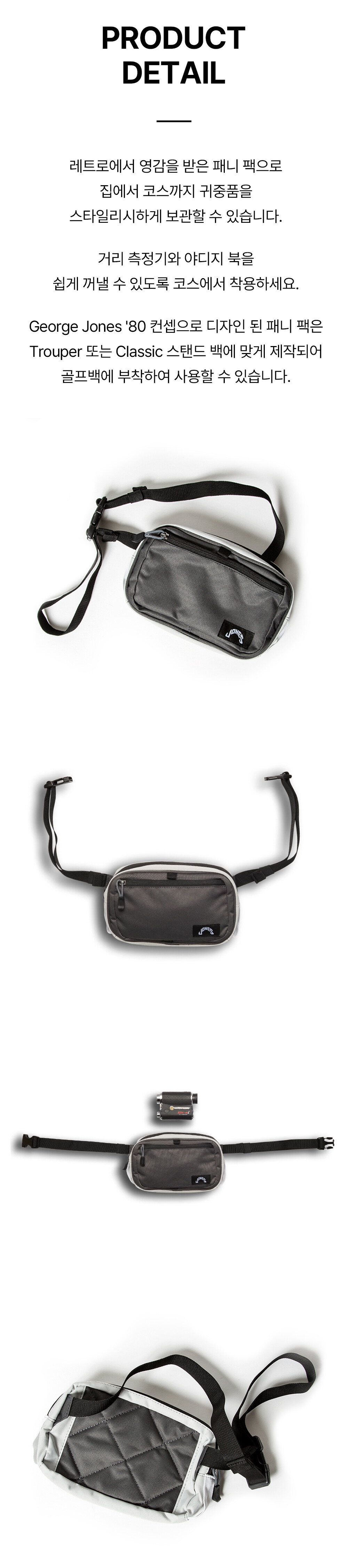 George Jones '80 컨셉으로 디자인 된 패니 팩은 Trouper 또는 Classic 스탠드 백에 맞게 제작되어 골프백에 부착하여 사용할 수 있습니다.