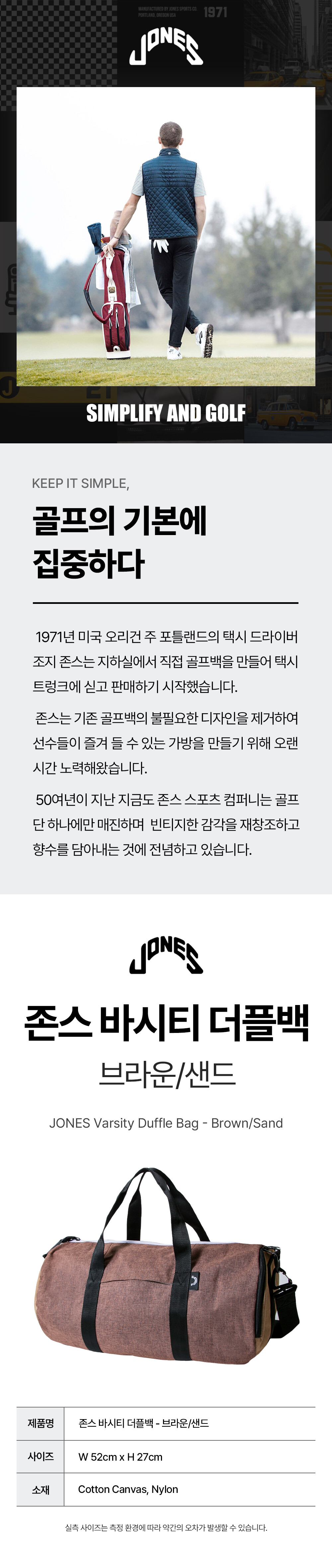 코튼 캔버스 소재의 더플백입니다. 아웃도어 테이스트의 골프 스타일을 제안하는 존스다운 가방입니다.
